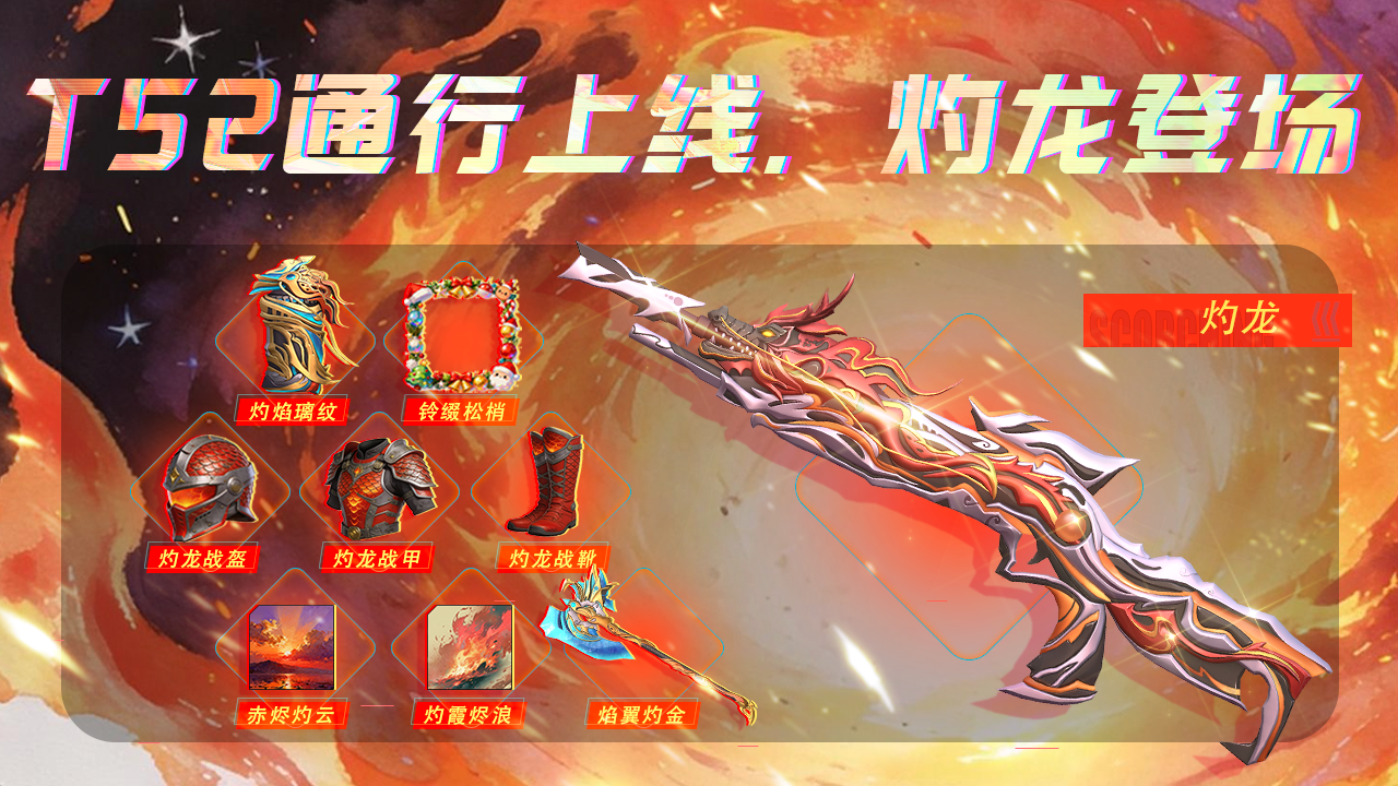 01-22【通行证T52的专属奖励】传奇龙武器-灼龙,近战-焰翼灼金、饰品-灼焰璃翎、手雷